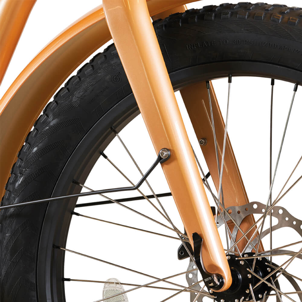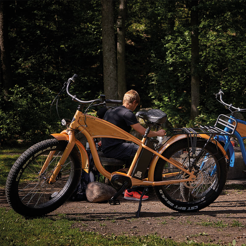 Vår uppdaterade fatbike cruiser levererar cykelglädje utöver det vanliga. Elcykeln ger dig kraft att cykla längre. Med ett stort batteri och kraftiga däck så tar den dig dit du vill utan problem, oavsett årstid.