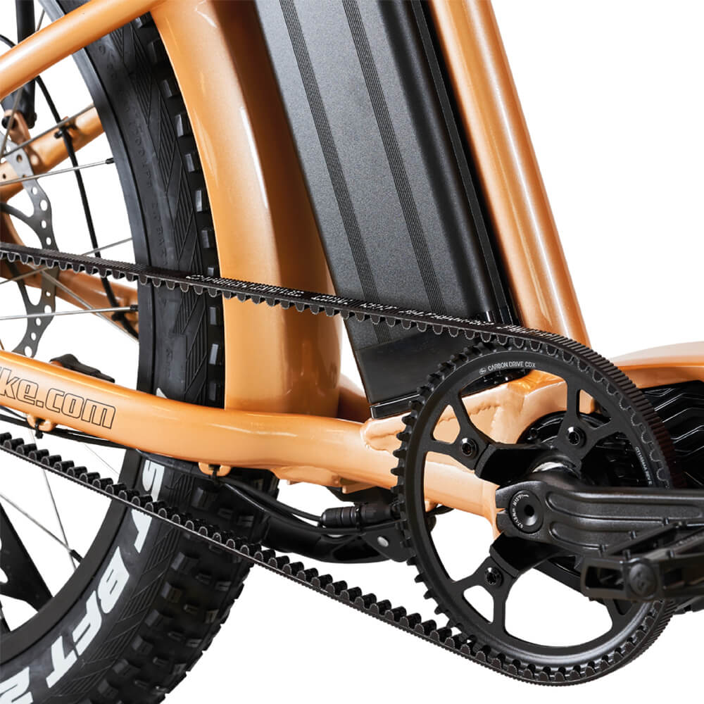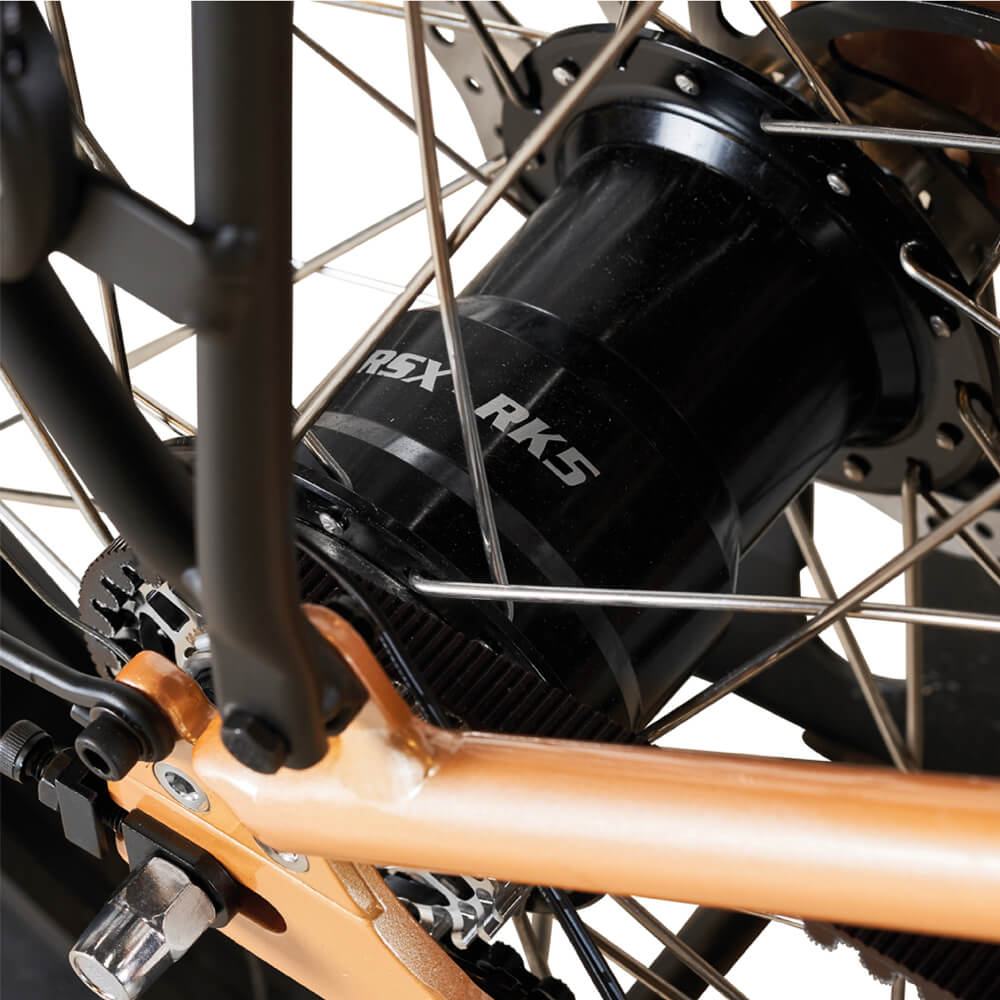 Motorn från Bafang (M500) är mittmonterad på otroliga 95n.m och har kapacitet på 25km/h. Vi har även satt på de senaste navväxlarna från Sturmey Archer som dels är väldigt tystlåtna, men också väldigt robusta och kraftfulla. Modellen är 5-växlad. Till det har vi valt remdrift från Gates Carbon, då vi sakta men säkert byter ut alla kedjor till rem på våra modeller. Dels för att göra skötseln enklare, då man slipper smörja kedjan för att förhindra rost på utanpåliggande växlar, men även för hållbarheten då remmen har en mycket längre livslängd än en kedja. Cykeln blir på så vis optimal för åretrunt pendling/cykling.